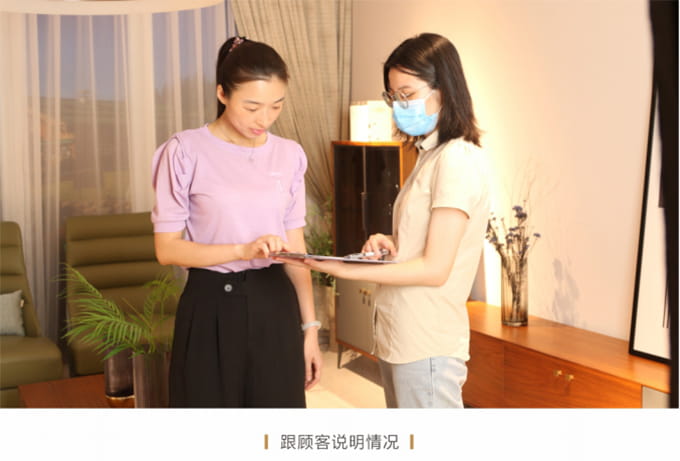 耐心解答客户提出的关于家具保养的提问,同时将金沙js93252产品使用说明书送给客户,尔后教客户如何扫描产品二维码进行防伪鉴定,请顾客对货物进行验收检查,然后正式签收《产品配送单》。